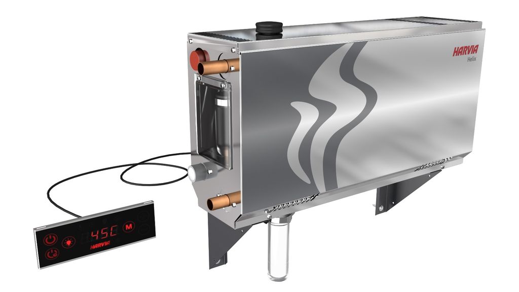 Парогенератор Harvia HELIX HGX60, выносной пульт в комплекте: задание температуры, времени включения устройства, управление подачей ароматизаторов в парилку, освещением и вентиляцией в парилке.