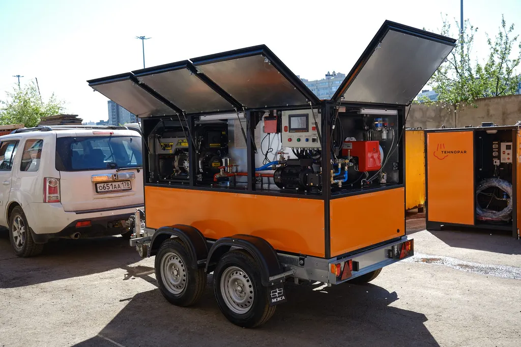 Мобильный дизельный парогенератор на легковом прицепе STEAMPRESSOR SH-4 предназначен для работ в зимнее время в строительной, нефтедобывающей, газовой, железнодорожной отраслях.