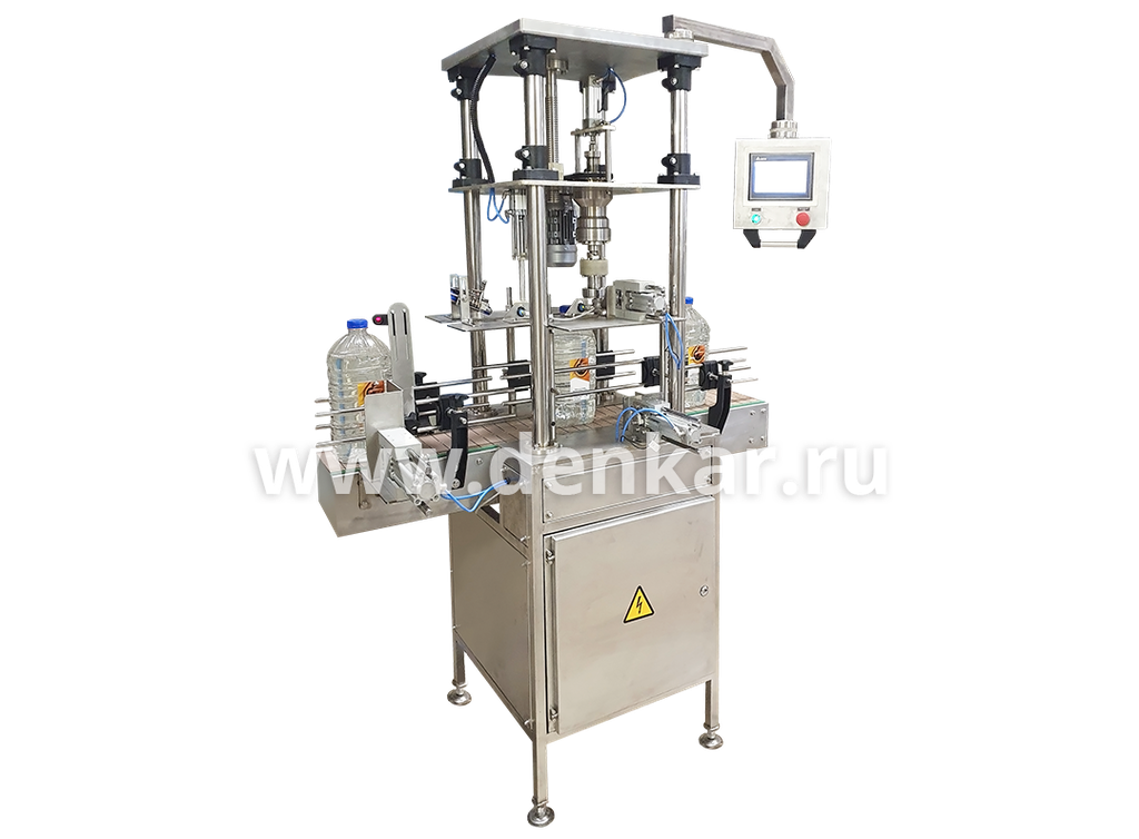 Укупорочный автомат УА-1000 под пластиковую бутылку УА-1000 производительностью до 1000 бут/ч предназначен для автоматического укупоривания пластиковых бутылок (ПЭТ-тары) емкостью от 4 до 6 литров полиэтиленовыми винтовыми крышками (стандарт BPF/PCO). Укупорочная машина оснащена панелью оператора, которая используется для отображения данных о рабочих процессах и внесения корректив в работу машины через дисплей.